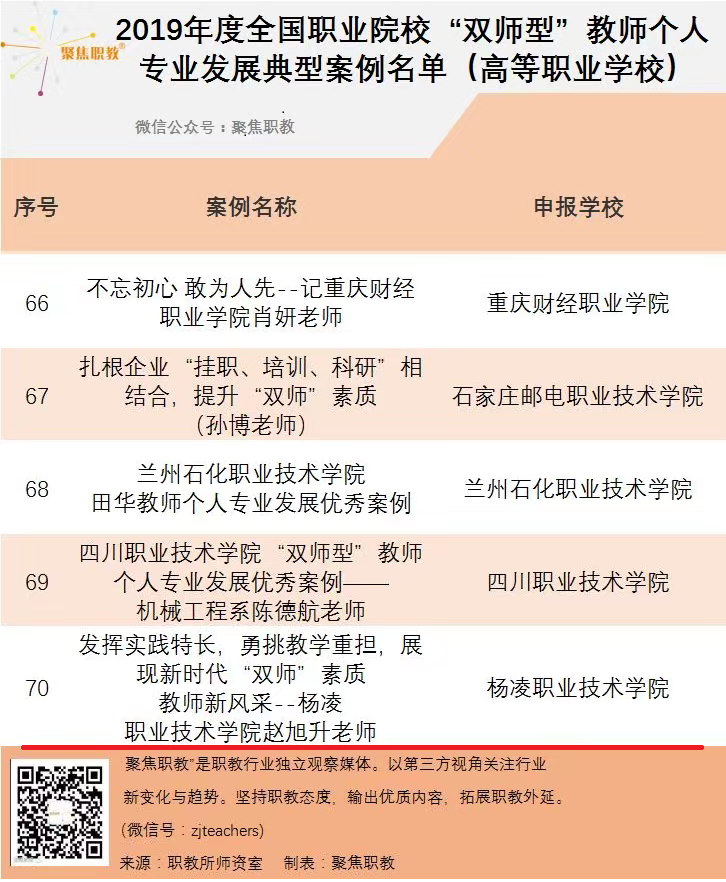 近日教育部职业技术教育中心研究所公布了2019年度全国职业院校“双师型”教师队伍建设典型案例公示名单,我院“校企行政四方协同,内培外引两手并重,着力打造一流‘双师型’教师队伍”案例入选全国职业院校“双师型”教师队伍建设典型案例;我院水利工程分院赵旭升老师“发挥实践特长,勇挑教学重担,展现新时代‘双师’素质教师新风采”案例入选全国职业院校“双师型”教师专业发展典型案例。