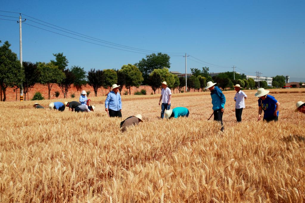 高温干旱天气为麦收作业提供了良好条件。金色的麦田被太阳晒得金灿灿的,成熟的麦穗颗粒饱满,丰收在望。育种是个精细活,育种试验地的收获环节更不得马虎。大家戴着草帽、手握镰刀来到麦田里,左手抓一把麦杆,右手握着镰刀迅速摸根割下,开始对不同麦系小麦品种进行收割。2013年初,在省农业农村厅的大力支持下,赵瑜小麦育种基地购置了进口小麦小区联合收割机,改变了长期以来育种试验收获全靠手工操作的状况。收割了一会后,大家参观了正在现场作业的收割机。看着色泽金黄、颗粒饱满的麦粒从卸仓口蹦跳进袋子里,大家都为赵瑜研究员感到高兴。
