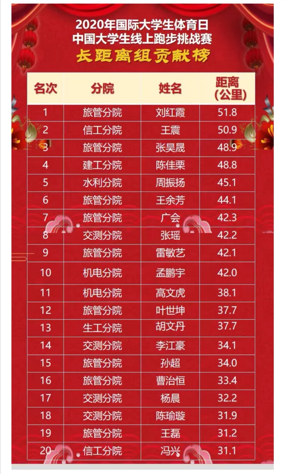 9月18日到20日中国大学生体育协会发起“2020年国际大学体育日·中国大学生线上跑步挑战赛”,我院在比赛中获得全国第十四名, 陕西高校排名第一,全国高职院校中排名第三