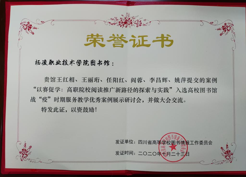 10月23日24日,高校图书馆战时期服务教学优秀案例展示研讨会在四川大学召开。我校图书馆案例《以赛促学:高职院校阅读推广新路径的探索与实践》入选优秀案例,并在大会上作了交流。