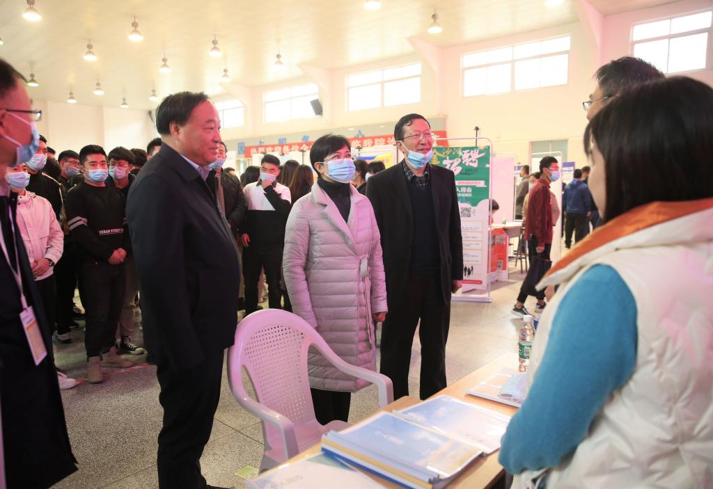 党委书记陈宁、校长王周锁、党委副书记任得元及招生就业处处长袁军儒等到招聘会现场,对招聘企业代表进行慰问,询问其招聘计划、目前的招聘情况及往届毕业生在企业的发展状况等。校领导表示,非常欢迎和感谢各招聘企业来我校招聘选拔人才,更期待企业能够与我校加强深度校企合作。同时,学校领导也与现场求职学生进行了亲切交谈,询问其求职现状,积极鼓励求职学生不忘初心、转变观念、扎根基层、服务社会。