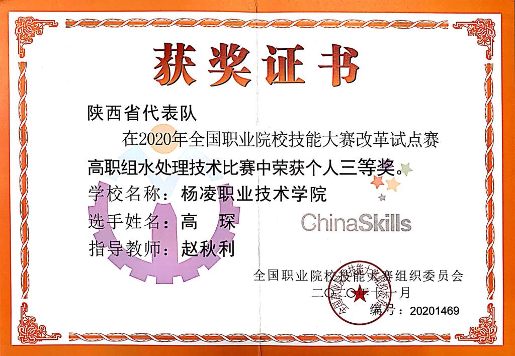 11月27日28日,2020年全国职业院校技能大赛改革试点赛高职组“水处理技术”赛项在山东科技职业学院举办,来自全国各地29支代表队参赛,我校生态环境工程分院学生高琛荣获比赛个人三等奖。