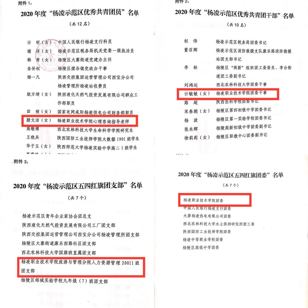 为表彰先进、树立典型,引导和激励广大团员、团干部和各级团组织奋发进取、再创佳绩,在五四青年节来临之际,共青团杨凌示范区团工委对示范区团员青年、团干部和各级团组织进行了表彰。校团委获2020年度“杨凌示范区五四红旗团委”称号,旅游与管理院人力资源管理20011班团支部荣获“杨凌示范区五四红旗团支部”称号;教师计敏敏荣获“杨凌示范区优秀共青团干部”称号;教师腊文洁荣获“杨凌示范区优秀共青团员”称号。