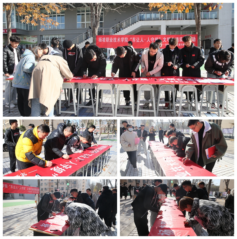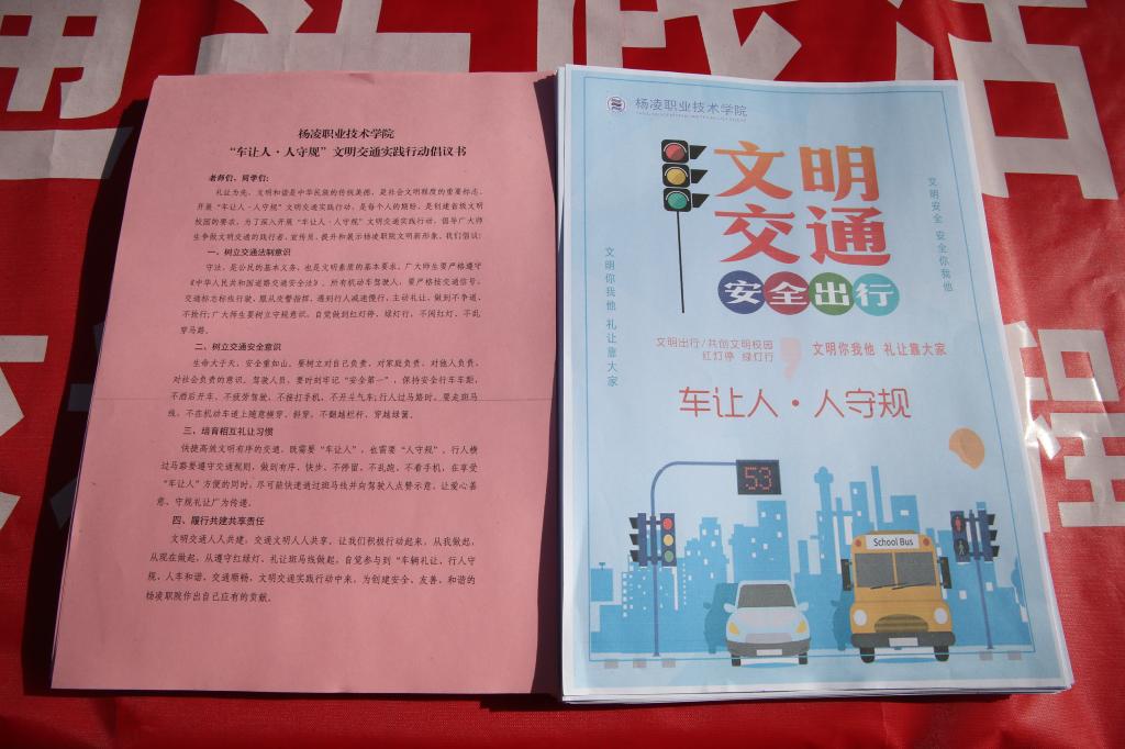 活动中,学校印发《“车让人·人守规”文明交通实践行动倡议书》和车让人·人守规”公益海报,通过在停车场、食堂门口、校内各个路口等地向师生们发放资料、现场宣讲交通法律法规等形式倡导广大师生争做文明交通的践行者、宣传员,提升和展示杨凌职院文明新形象。随后师生们纷纷在活动横幅上签上自己的名字。