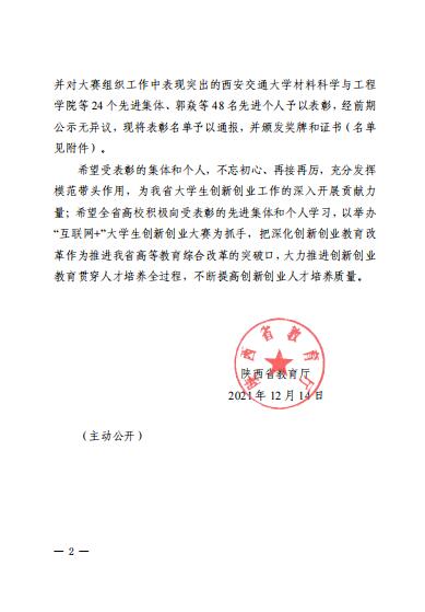 12月14日,省教育厅公布第七届中国国际“互联网+”大学生创新创业大赛陕西赛区组织工作先进集体和先进个人,学校产教融合处荣获先进集体,生物工程学院杨振华、产教融合处刘颖沙荣获先进个人。全省共有24个先进集体、48名先进工作者受到省教育厅表彰。
