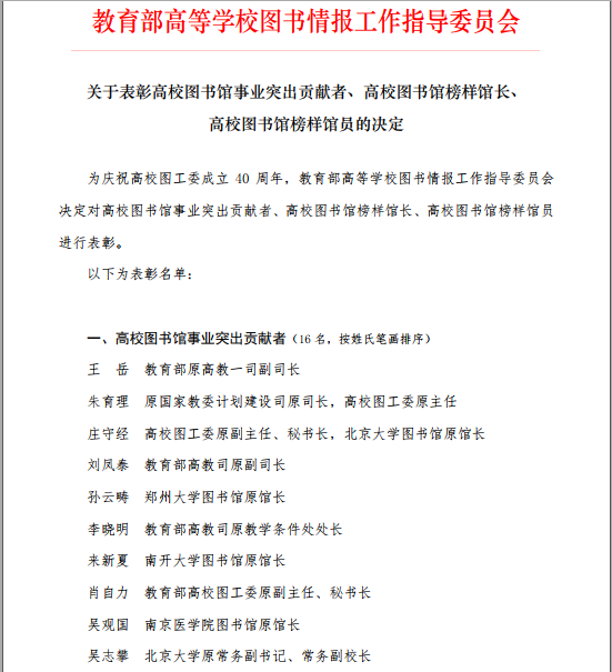 教育部高等学校图书情报工作指导委员会是在教育部领导下,对高等学校图书情报事业进行统筹、协调、咨询、研究和业务指导的专家组织。此次“榜样馆员”是由全国各高校在从事图书馆工作20年及以上且目前仍在岗的优秀馆员中推选评出,全国有198名馆员获得该项荣誉,我校也是全省获此殊荣的8所高校之一。