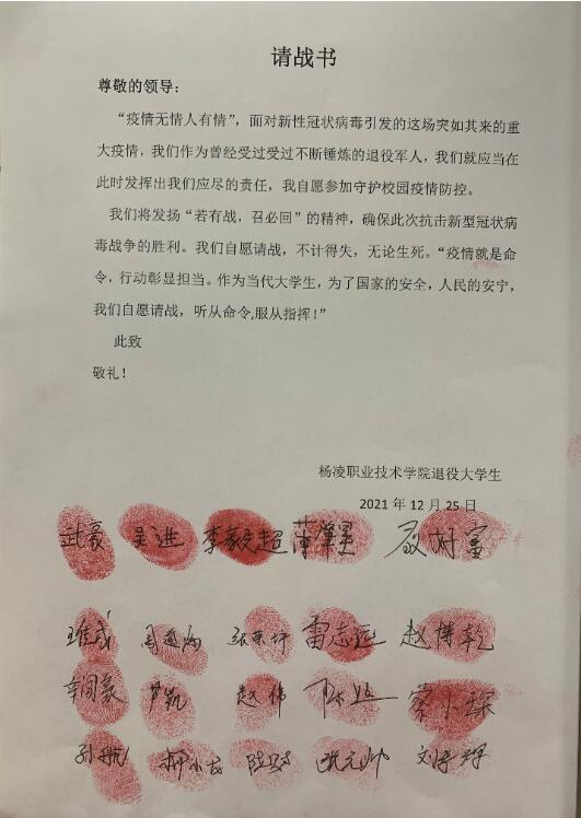 疫情就是命令,防控就是责任。在疫情防控中,以实际行动践行“若有战、召必回”的使命担当,凝聚众志成城、共克时艰的磅礴青春正能量,为广大师生做好抗疫特殊时期的服务工作。他们写下请战书,宣誓坚守岗位、严守纪律、服从指挥,与全校师生携手积极参与到学校疫情防控工作各个环节,体现了当代杨职学子的本色和担当。面对低温、寒冷的天气,他们永不退缩,积极配合学校的防疫工作参与我校核酸检测的疏导工作,志愿服务,守护有我,在平凡的工作岗位上诠释着自己的初心和使命。