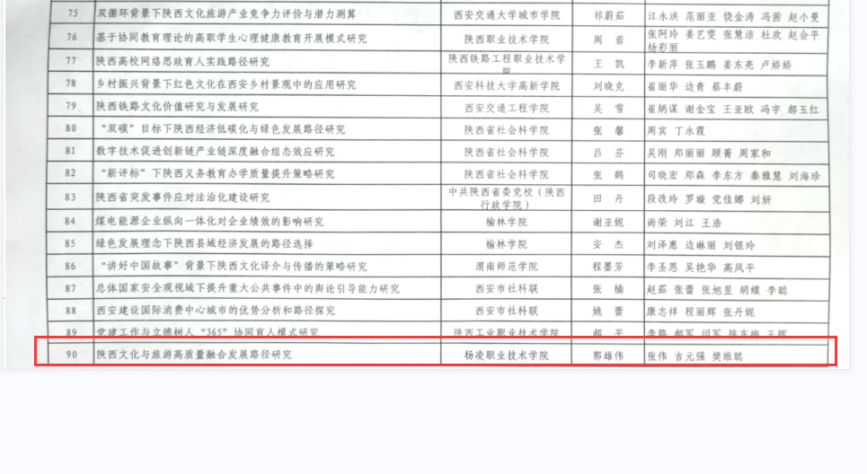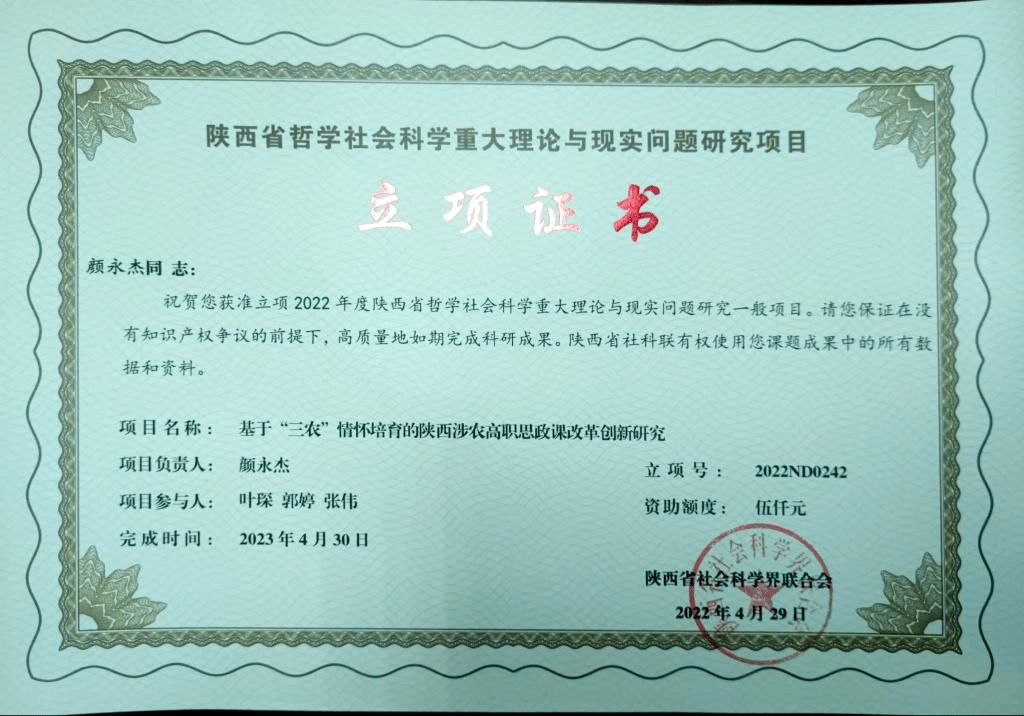 近日,陕西省社会科学界联合会发布文件,学校颜永杰老师主持的课题《基于“三农”情怀培育的陕西涉农高职思政课改革创新研究》获批哲学社会科学重大理论与现实问题研究一般项目郭雄伟老师主持的课题《陕西文化与旅游高质量融合发展路径研究》获批哲学社会科学重大理论与现实问题研究资助项目。