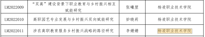 近日,全国职业院校巩固扶贫成果服务乡村振兴协作联盟公布2022年课题立项名单,我校张曦堃老师主持申报的“双高”建设背景下职业教育与乡村振兴相互赋能研究项目妙晓莉老师主持申报的高职园艺专业发展与乡村振兴双向赋能研究项目李姗姗老师主持申报的涉农高职教育服务乡村振兴战略的路径研究项目获批立项