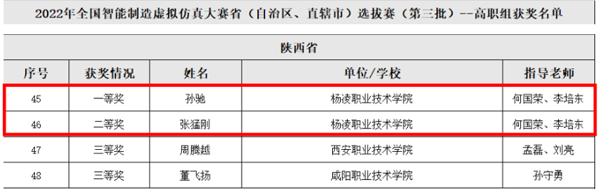 7月9日,由中国自动化学会主办的2022年全国智能制造虚拟仿真陕西省选拔赛线上举行学校机电工程学院学生孙驰张猛刚分别获得陕西省第一二名的好成绩,并均获得全国总决赛参赛资格。