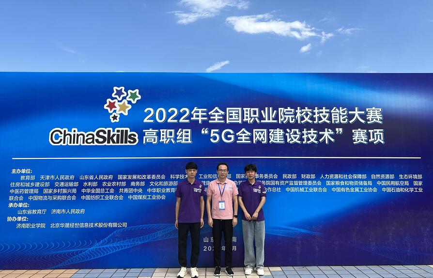8月22日至23日,2022年全国职业院校技能大赛高职组“5G全网建设技术”赛项在济南职业学院举办,来自全国28个省、56支代表队、112名选手参加了比赛。经过8个小时的激烈比拼,我校信息工程学院学生郑嘉昊、曹文森以总分排名全国第一的成绩,荣获一等奖第一名,取得我校自参赛以来历史最好成绩指导教师康晋、陈高锋荣获大赛优秀指导教师奖