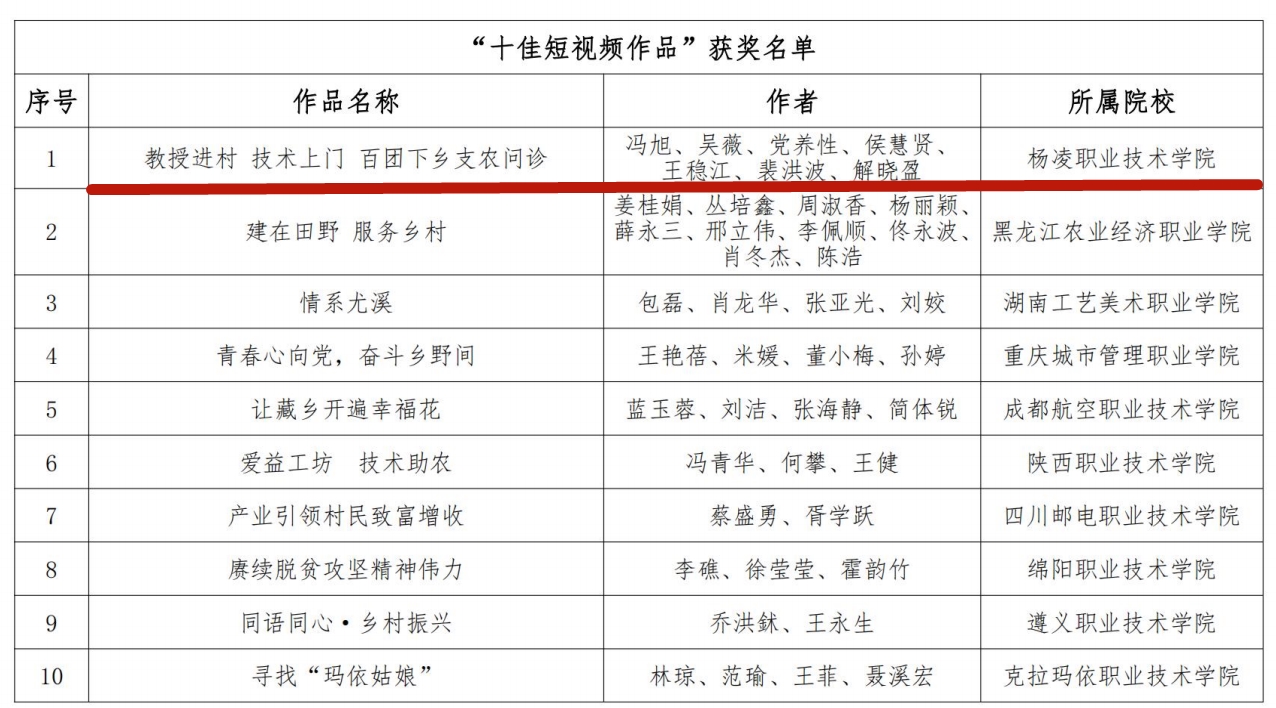 11月13日,全国职业院校巩固扶贫成果服务乡村振兴协作联盟公布了“乡村振兴 职教同行”摄影暨短视频大赛作品评选结果,冯旭团队创作的短视频《教授进村技术上门百团下乡支农问诊》获得“十佳短视频作品”,我校获优秀组织奖获奖作品将通过联盟公众号和网站宣传推介并向全国主流媒体和上级部门重点宣传推介。