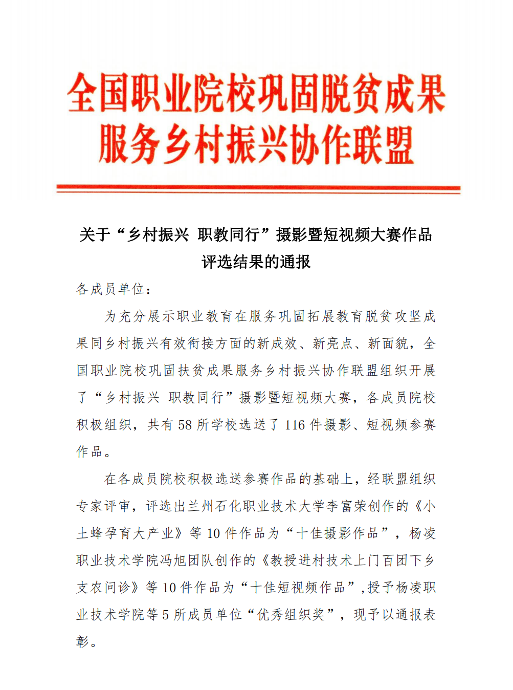本次大赛共有58所学校选送了116件摄影、短视频参赛,充分展示了职业教育在服务巩固拓展教育脱贫攻坚成果同乡村振兴有效衔接方面的新成效、新亮点、新面貌,分享乡村振兴好经验和做法,传递职业教育助力乡村振兴最强音。