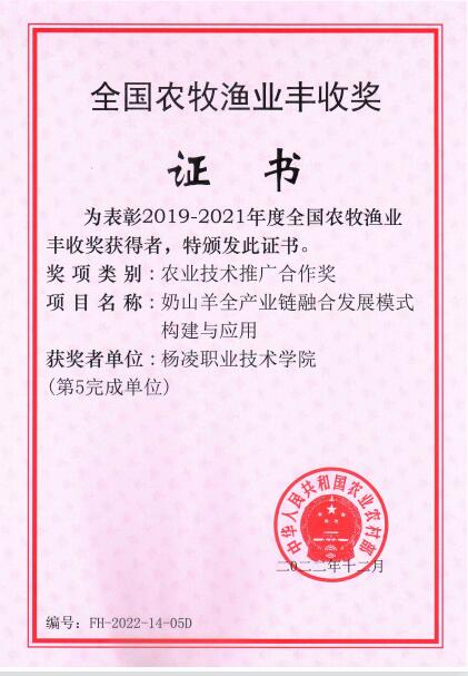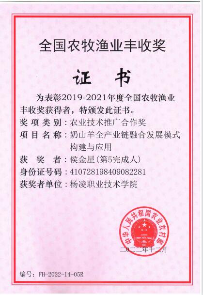 近日,2019—2021年度全国农牧渔业丰收奖获奖名单公布,我校动物工程院侯金星副教授参与申报的“奶山羊全产业链融合发展模式构建与应用”项目,获得全国农牧渔业丰收奖农业技术推广合作奖,侯金星为第五完成人杨凌职业技术学院为第五完成单位。