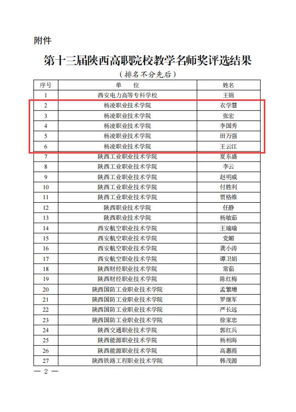 近日,省教育厅公布关于表彰第十三届陕西高职院校教学名师奖获奖教师的通知,我校衣学慧、张宏、李国秀、田万强、王云江5位教授获评第十三届陕西高职院校教学名师奖。