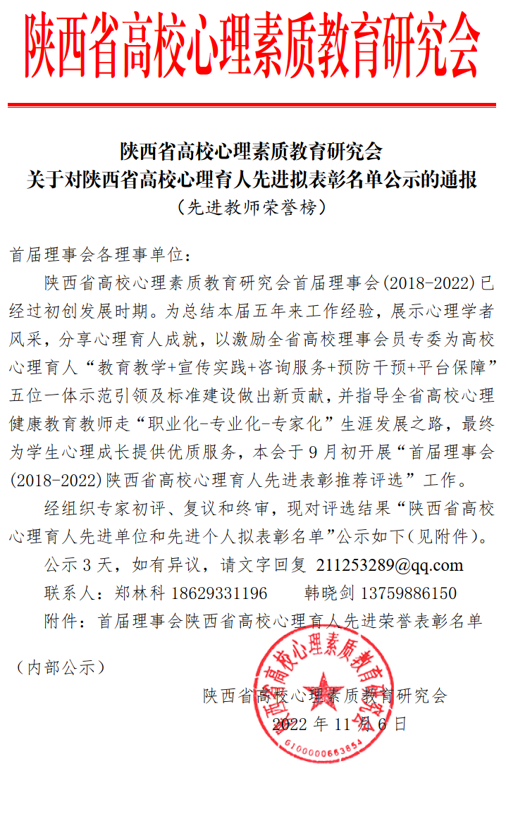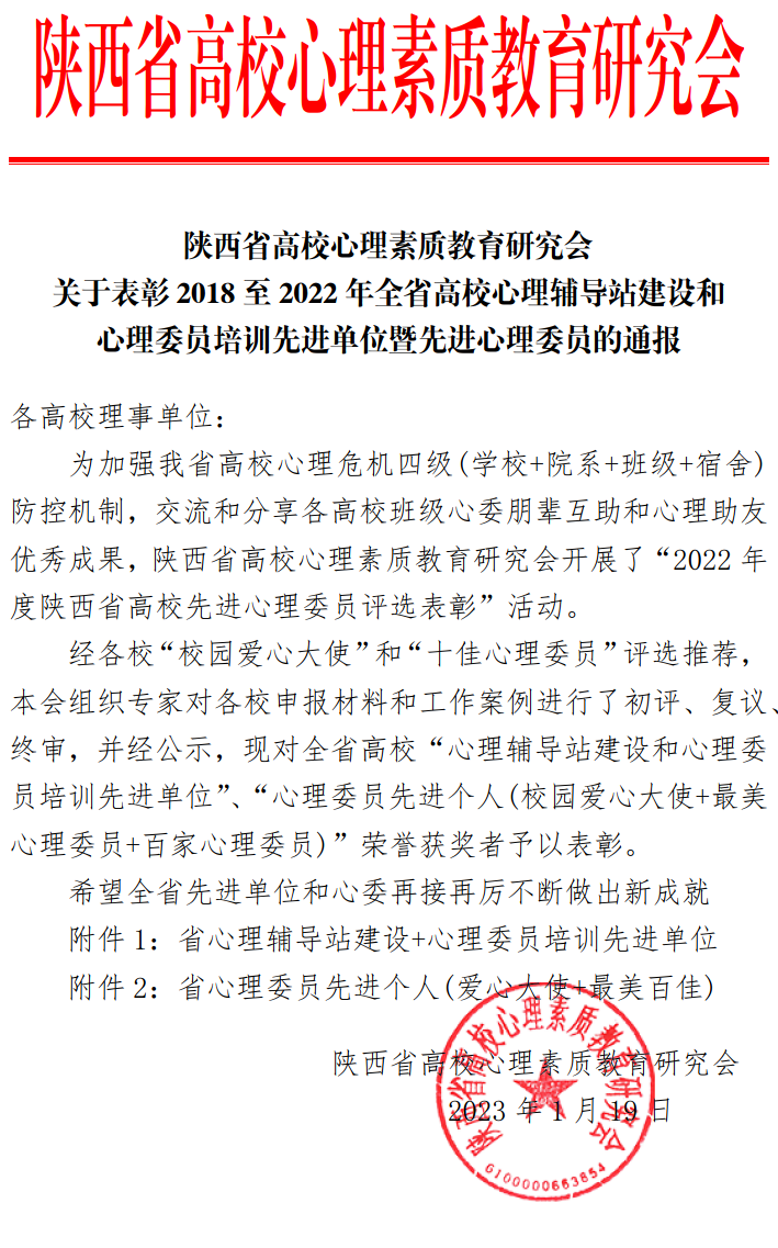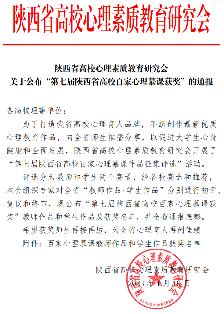 近日,由陕西省高校心理素质教育研究会举办的首届理事会(2018-2022)陕西省高校心理育人先进表彰推荐评选2022年度先进成就表彰与第七届校心理慕课作品评选活动落下帷幕,学校获陕西省高校“心理育人标兵单位”,5名学生、3个学生作品获奖