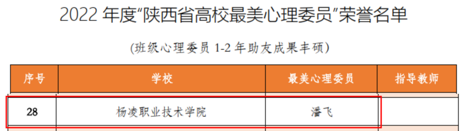 其中,建筑工程学院学生王闫星“陕西省高校校园爱心大使”信息工程学院学生潘飞“陕西省高校最美心理委员”经济与贸易学院学生骆玉婷建筑工程学院学生王辰希水利工程学院学生李嘉炜“陕西省高校百佳心理委员”。荣获第七届陕西省高校百家心理慕课作品的包括:水利工程学院学生王子璋作品微电影《君心向水》“情景剧心理慕课奖”一等奖心理微视建筑工程学院学生作品手语剧《明天会更好》“治愈系心理慕课奖”一等奖心理微视旅游与管理学院学生周怡盼作品微电影《默》“情景剧心理慕课奖”二等奖心理微视