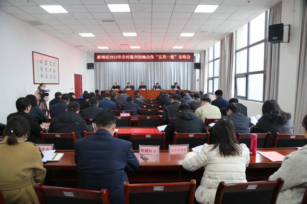 2月28日上午,彬州市召开2023年乡村振兴校地合作“五共一建”安排会。我校副校长胡俊鹏,科教处处长冯旭;咸阳市乡村振兴局副局长燕志敏,彬州市市委副书记任挺、副市长石万虎参加会议。