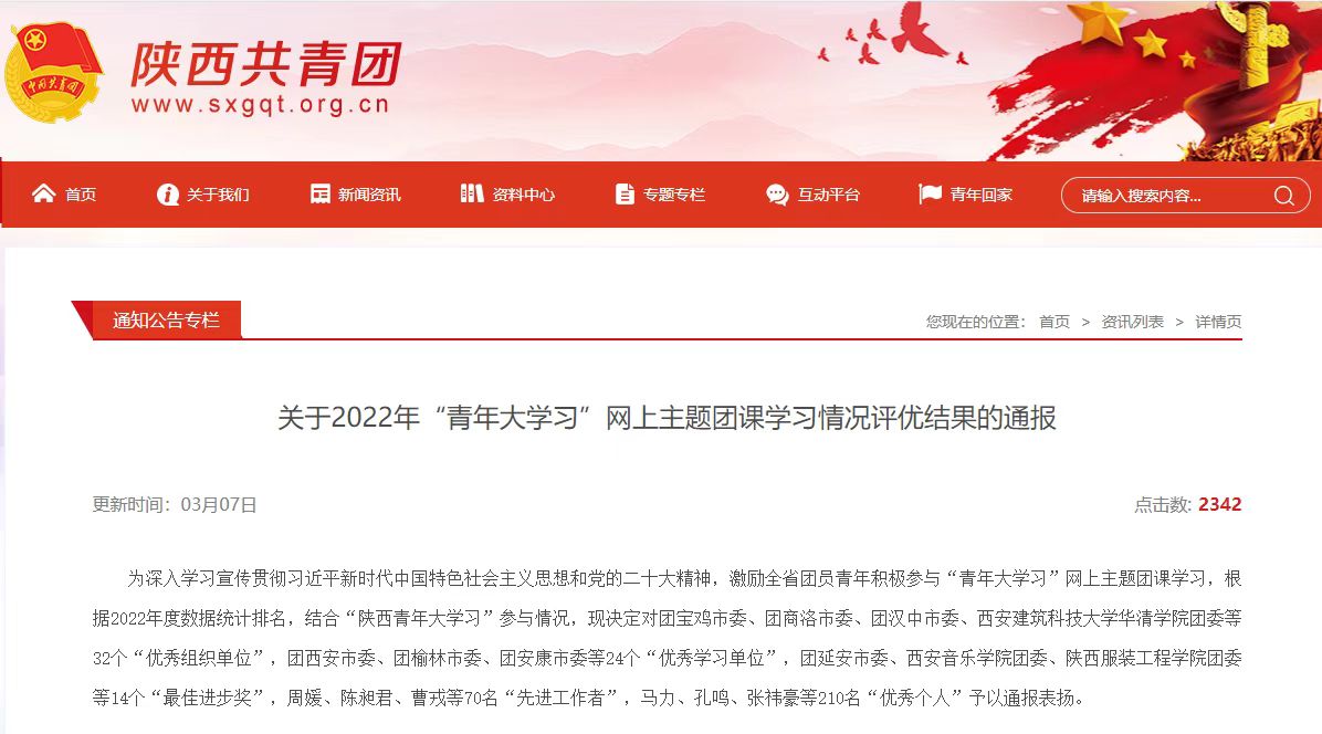 为深入学习宣传贯彻习近平新时代中国特色社会主义思想和党的二十大精神,激励团员青年积极参与“青年大学习”网上主题团课学习近日,团省委对全省2022年“青年大学习”网上主题团课学习情况评优结果予以表彰通报。校团委荣获“优秀学习单位”称号,信息工程学院教师赵朋波荣获“先进工作者”称号,建筑工程学院学生王帅、药物与化工学院学生刘梦梦动物工程学院学生张宇博荣获“优秀个人”称号。