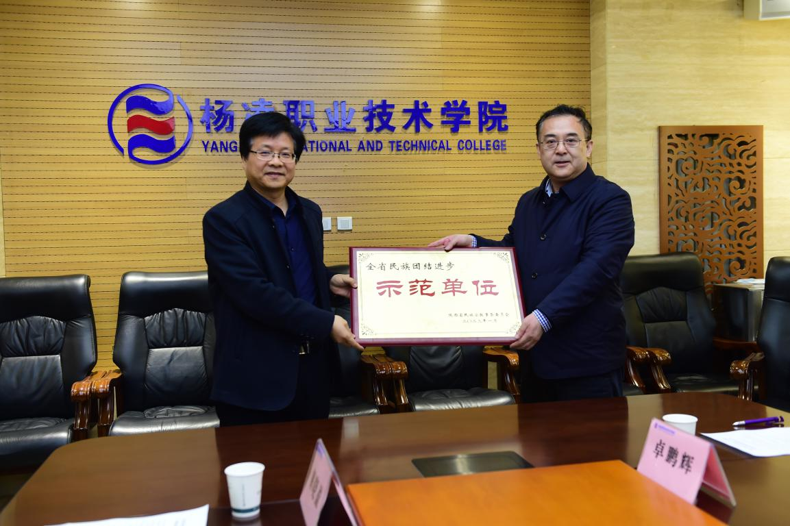 323日,学校举行“全省民族团结进步示范单位”授牌仪式。省民宗委党組成员、副主任王晓斐,民族一处处长张岩松,省民宗委民族一处二级调研员严鹏博,杨凌示范区党工委统战部一级调研员王勇林,我校党委副书记任得元、党委统战部部长田争运、党委学工部部长陈军峰、党委保卫部部长周宁等参加授牌仪式。授牌仪式由党委副书记任得元主持。