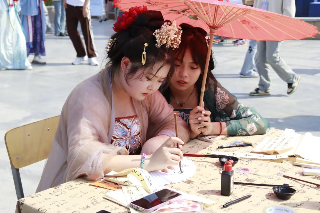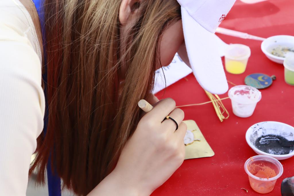 活动以“多彩非遗扬文化,‘遗’脉相承正禾风”为主题,包括非遗作品展览、非遗技艺展示和非遗项目互动等内容。在非遗作品展览现场,我国传统工艺品英山缠花、剪纸、绳编和掐丝珐琅等展品吸引了广大师生的目光,大家纷纷惊叹于我国工匠的智慧与技艺。在非遗技艺展示现场,学生们现场剪纸、点茶、缠花、绳编、植物拓染、彩绘、做纸伞和书法创作,让大家现场体验非遗文化魅力。在非遗项目互动环节,设置了投壶、象棋对弈和抽陀螺等游戏,大家踊跃参与,热情高涨。