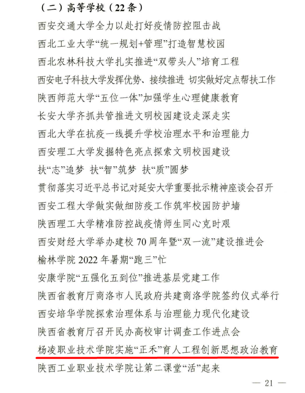 我校新闻作品《杨凌职业技术学院实施“正禾”育人工程 创新思想政治教育》,从挖掘“聚焦三教改革 搭建工程架构”“聚焦机制创新 推进多元参与”“聚焦涉农特色 加强耕读教育”“聚焦见行见效 打造品牌活动”四个方面,全面、准确地反映了我校实施正禾育人工程的基本情况、经验做法和取得成效,由于层次清晰、内容翔实,对兄弟院校相关工作具有重要借鉴意义而获表彰。