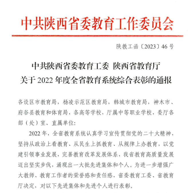 近日,省委教育工委、省教育厅印发《关于2022年度全省教育系统综合表彰的通报》。我校新闻作品《杨凌职业技术学院实施“正禾”育人工程 创新思想政治教育》获省教育厅网站教育好新闻。