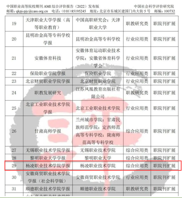 3月15日,中国社会科学评价研究院(CASSES)发布了《中国职业高等院校期刊AMI综合评价报告(2022年)》,根据职业高等院校学报和专业刊发展的特点,对全国职业高等院校主办的164种学术期刊分3个属性大类和8个学科类分别进行评价,评选出14种“职院刊核心期刊”,43种“职院刊扩展期刊”,107种“职院刊入库期刊”。我校学报入选中国职业高等院校期刊AMI综合评价“职院刊扩展期刊”,名列第29位,为陕西省入选期刊中唯一的综合应用类职院刊扩展期刊。