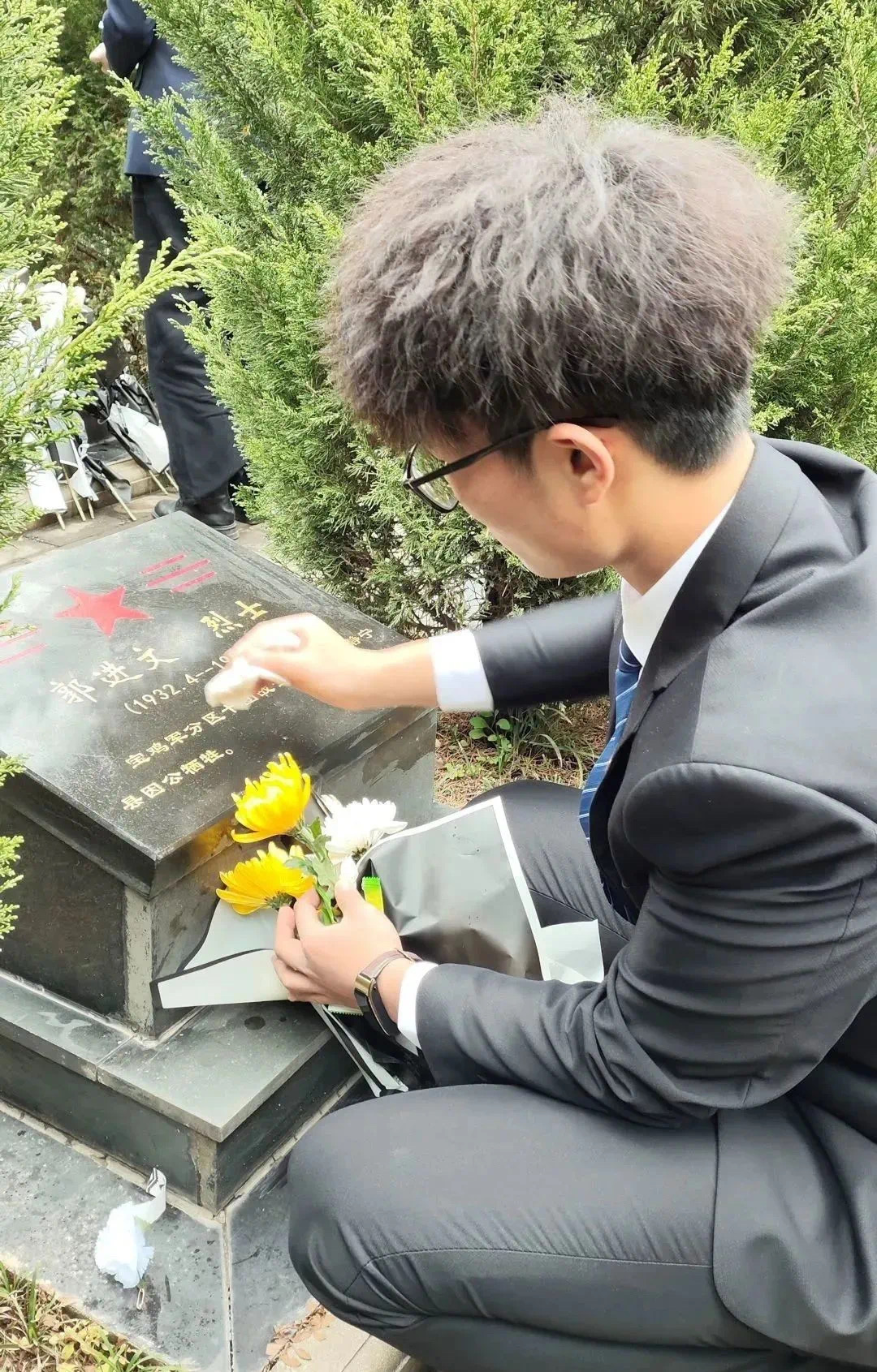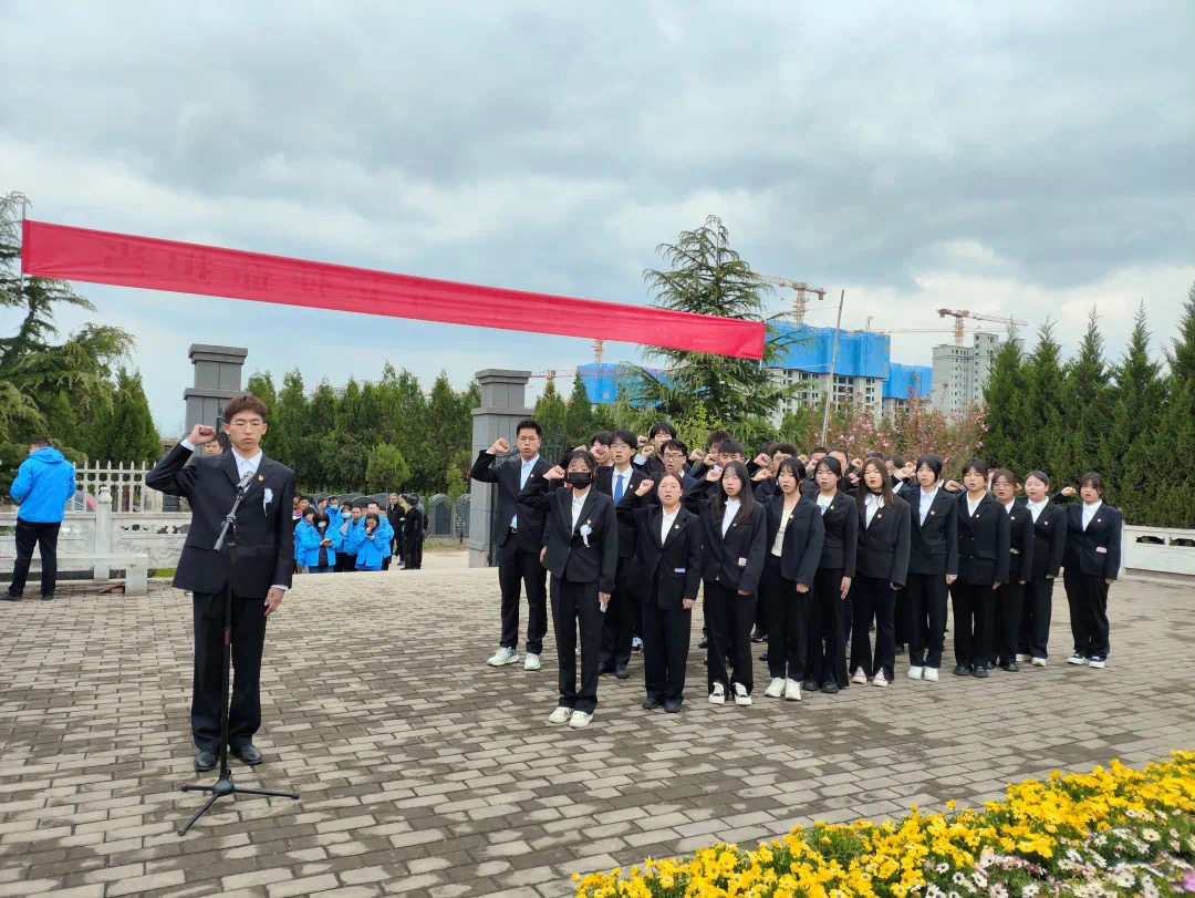 党员们身着正装、有序列队,怀着崇敬的心情进入陵园。在纪念碑前,大家重温入党誓词,瞻仰革命烈士纪念碑,聆听前辈们的英勇故事和感人事迹,默哀追思。随后,学生们走进陵园,为先烈献花、扫墓,表达深切的悼念与敬仰。