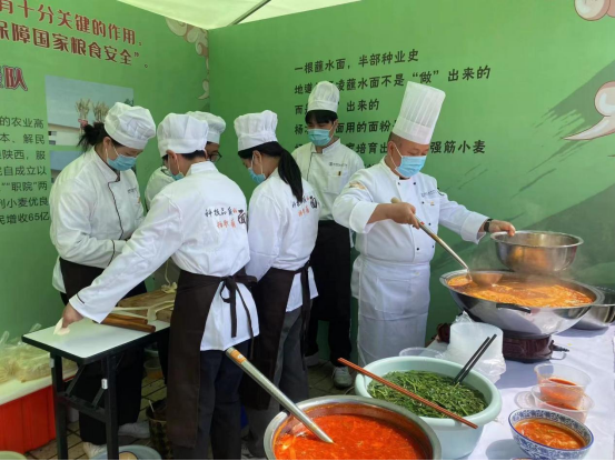 本次活动由党委宣传部和生物工程学院组织,遴选生物工程学院5名师生参赛,口号为“科技品质·杨职有‘面’”,使用的面粉是全国著名小麦育种专家、我校研究员赵瑜老师培育的“武农981”“武农988”小麦品种,这两个品种2021年通过国家农业部审定,目前在全国黄淮流域推广超过8000万亩,促进农民增收60亿元。