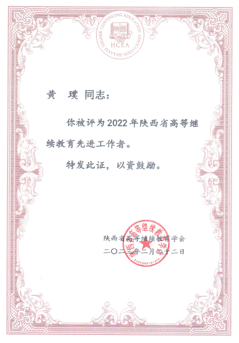 近日,陕西省高等继续教育学会公布2022年陕西省高等继续教育优秀继续教育学院、继续教育优秀校外教学站点、继续教育先进工作者评选结果,我校继续教育与培训学院荣获2022年陕西省高等继续教育优秀教育学院黄璞被评为2022年陕西省高等继续教育先进工作者。这是我校继续教育与培训学院连续三次获此殊荣。