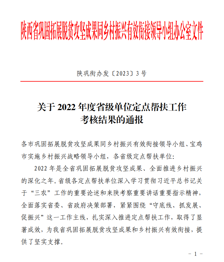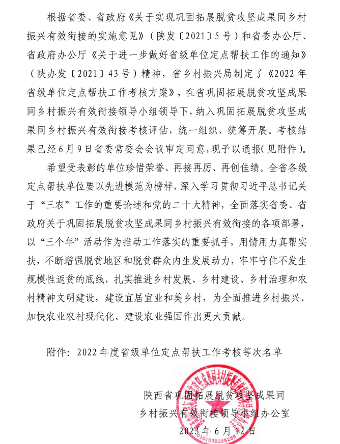 近日,省巩固拓展脱贫攻坚成果同乡村振兴有效衔接领导小组办公室下发《关于2022年度省级单位定点帮扶工作考核结果的通报》,我校被评为考核“好”等次(最高等次)。