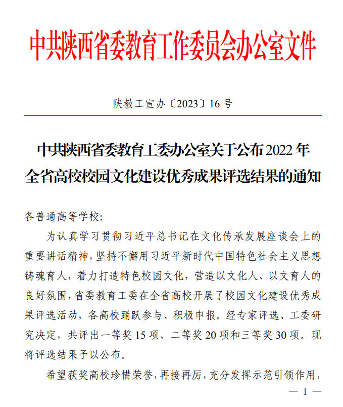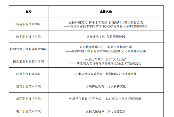 为坚持不懈用习近平新时代中国特色社会主义思想铸魂育人,着力打造特色校园文化,营造以文化人、以文育人的良好氛围,省委教育工委在全省高校开展了校园文化建设优秀成果评选活动。经专家评选、工委研究决定,共评出一等奖 15 项、二等奖 20 项和三等奖 30 项。其中,我校《弘扬后稷文化 传承千年文脉 打造新时代耕读教育范式——杨凌职业技术学院以“后稷文化”提升育人品质的实践路径》获三等奖。