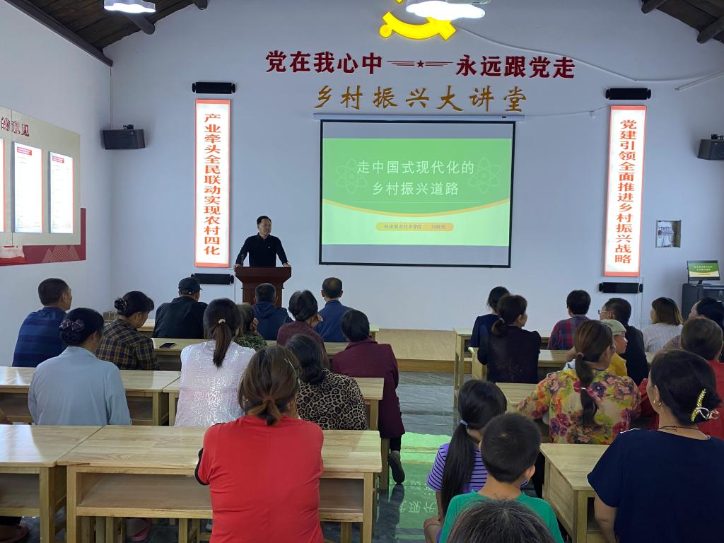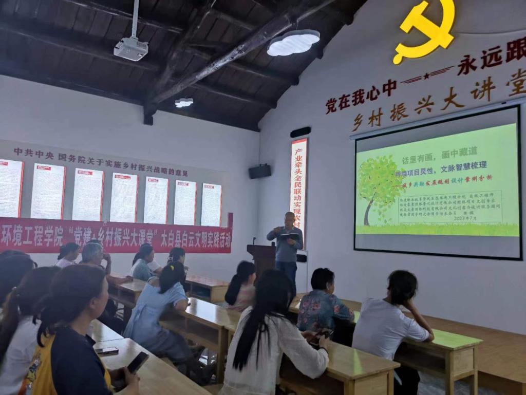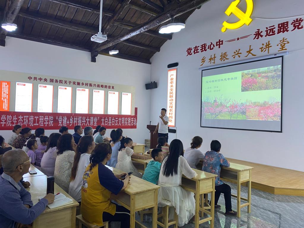 ——举办了4场乡村振兴报告会,助力治理有效。生态环境工程学院党总支书记孙承俊作了题为《学校高质量发展及人才培养工作》的报告,高级工程师陈祺作了题为《城乡共融发展规划设计案例分析》的报告,副教授张君超作了题为《桃花产业助力白云村乡村振兴》的报告,马克思主义学院副教授刘晓瑞作了题为《走中国式现代化的乡村振兴道路》的报告,用通俗易懂的语言和轻松活泼的授课方法,宣传宣讲党的二十大精神、乡村振兴战略、教育强国和文化兴村,村民们认真聆听,会场不时响起阵阵掌声。