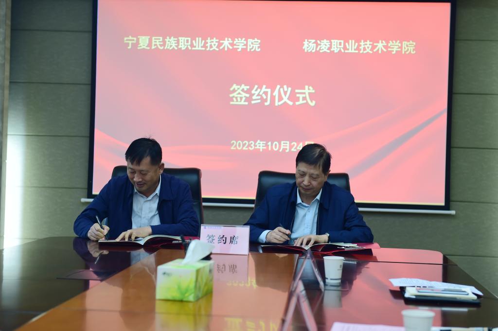 王周锁对焦玉柱一行来校调研表示欢迎,并从办学治学、人才培养、产教融合、教师创新团队建设等方面介绍了我校发展情况。焦玉柱对我校建设发展取得的成绩给予充分肯定,他介绍了宁夏民族职业技术学院的办学现状、师资队伍建设等情况。双方还签订了合作协议,将进一步加强在专业建设、师资建设、技能比赛等方面的交流合作。