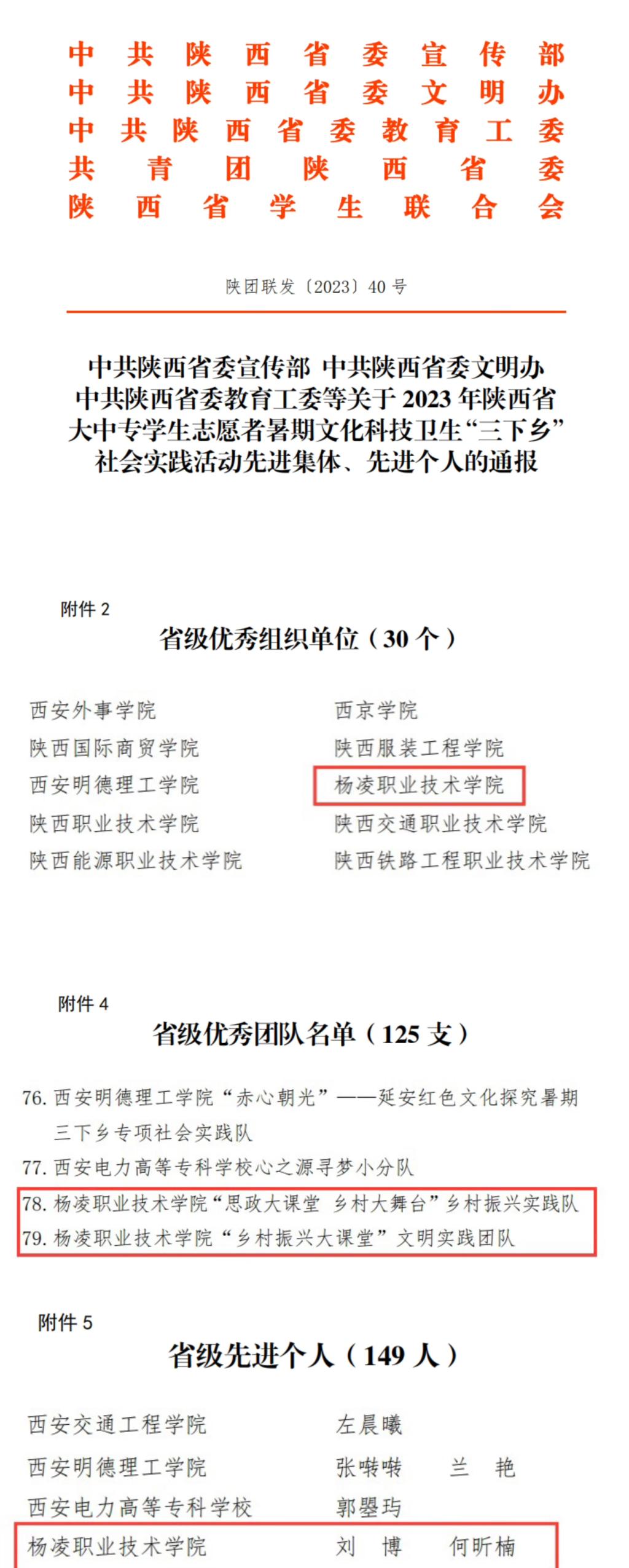 近日,省委宣传部、省委文明办、省委教育工委、共青团省委和省学生联合会对2023年陕西省大中专学生志愿者暑期文化科技卫生“三下乡”社会实践活动先进集体、先进个人予以表扬通报。我校教师刘博、何昕楠荣获省级先进个人,生态环境工程学院“思政大课堂 乡村大舞台”乡村振兴实践队、生物工程学院“乡村振兴大课堂”文明实践团队荣获省级优秀团队,学校荣获省级优秀组织单位。