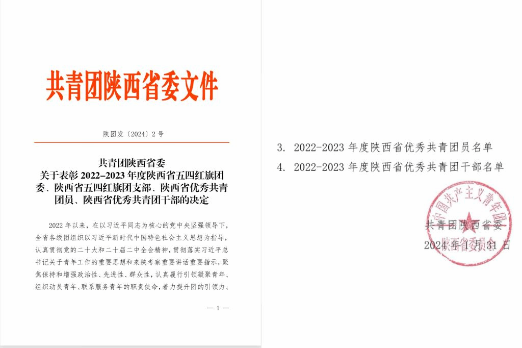 131,共青团陕西省委发布了陕西省2022-2023年度“两红两优”表彰决定,学校团委荣获陕西省五四红旗团委荣誉称号。