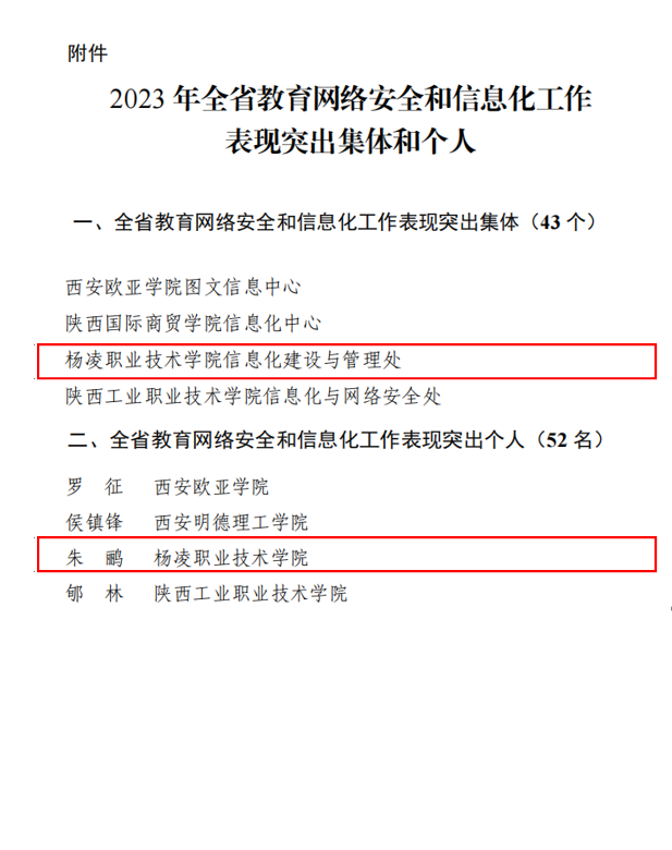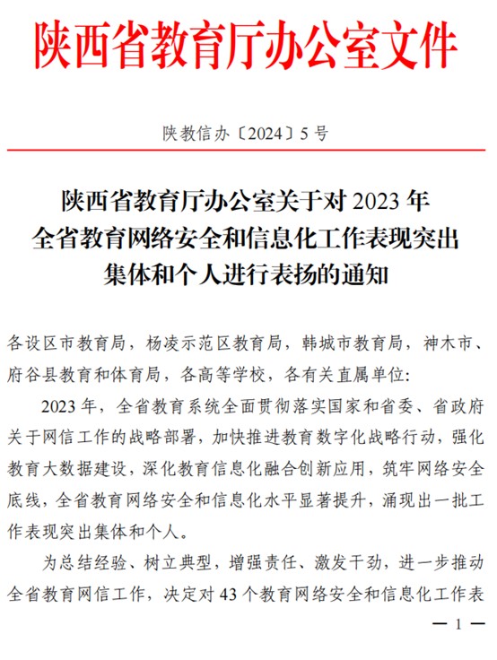 227日,陕西省教育厅发布了关于对2023年全省教育网络安全和信息化工作表现突出集体和个人表扬的通知,学校荣获全省教育网络安全和信息化工作表现突出集体,信息化建设与管理处朱鹂老师荣获全省教育网络安全和信息化工作表现突出个人。