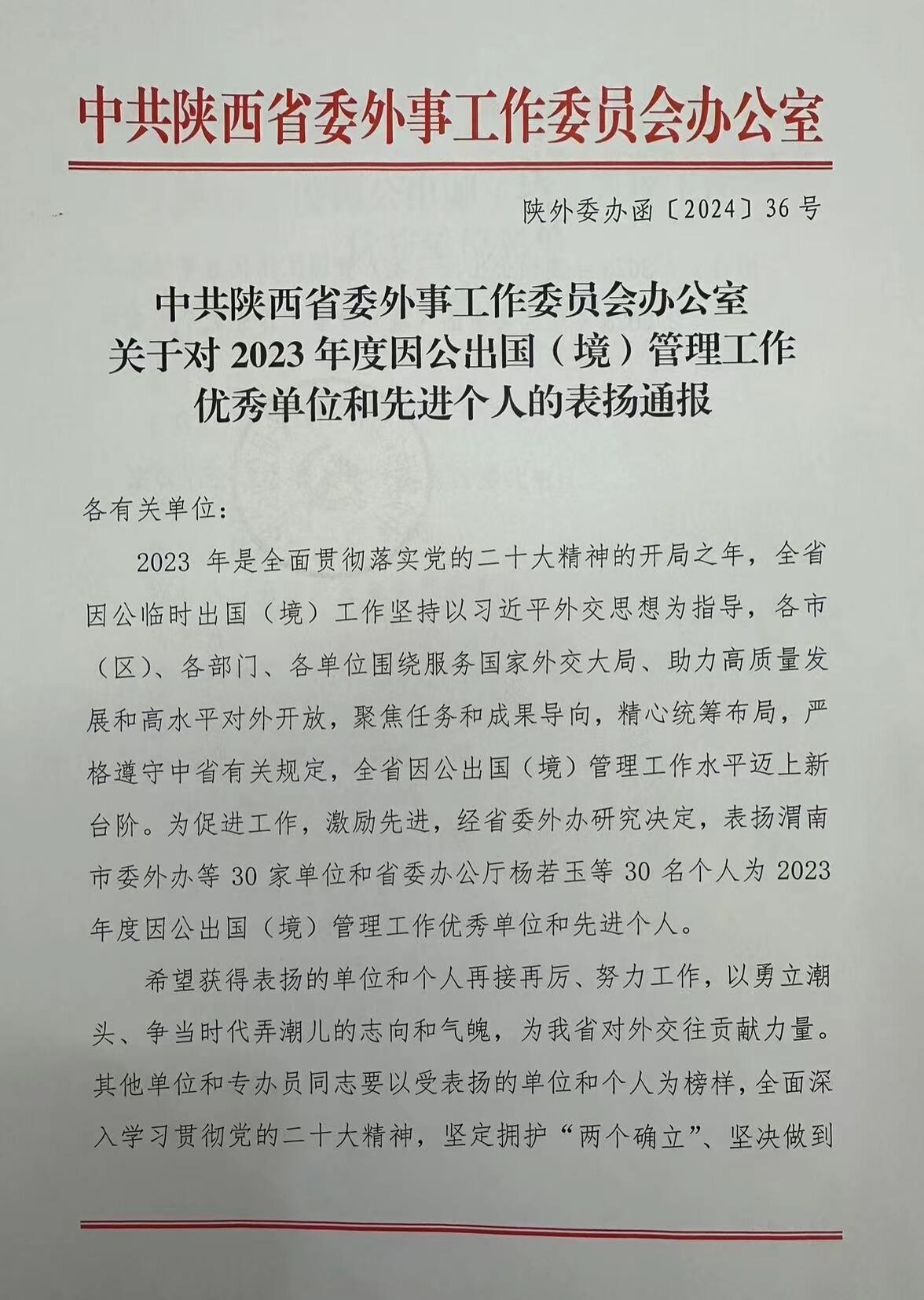 近日,中共陕西省委外事工作委员会办公室发布《关于对2023年度因公出国(境)管理工作优秀单位和先进个人的表扬通报》,表彰了在全省因公出国(境)工作中的优秀单位和先进个人。我校获评“2023年度因公出国(境)管理工作优秀单位”称号。