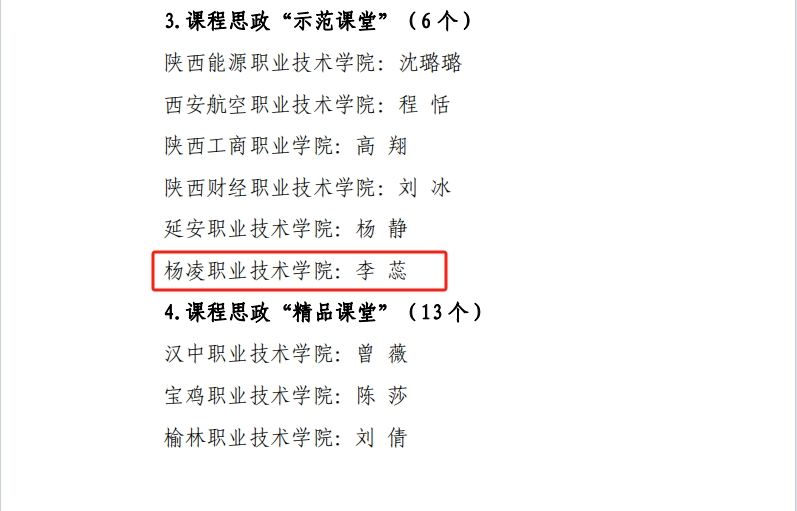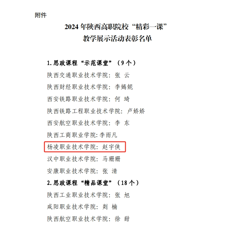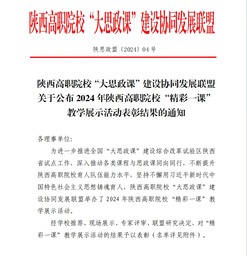 近日,由陕西高职院校“大思政课”建设协同发展联盟主办,我校承办的2024年陕西高职院校“精彩一课”教学展示活动表彰结果公布。马克思主义学院教师赵宇侠荣获思政课程示范课堂奖项,文理学院教师李蕊荣获课程思政示范课堂奖项。
