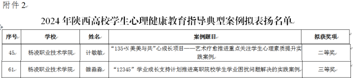530日,陕西省委教育工委公布了2024年第九届陕西高校心理育人宣传季活动表扬名单,我校学生朱洁琼获第三届陕西高校大学生“心相遇 爱同行——心理健康伴我成长”主题征文活动一等奖,杜正荣获二等奖。心理教师计敏敏获陕西高校学生心理健康教育指导典型案例二等奖、雒淼淼获三等奖。