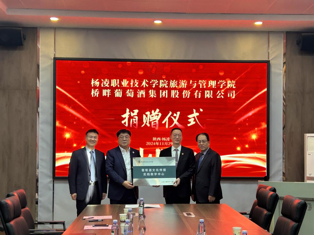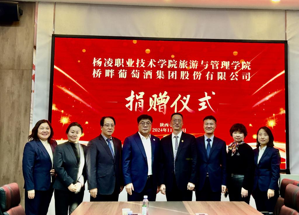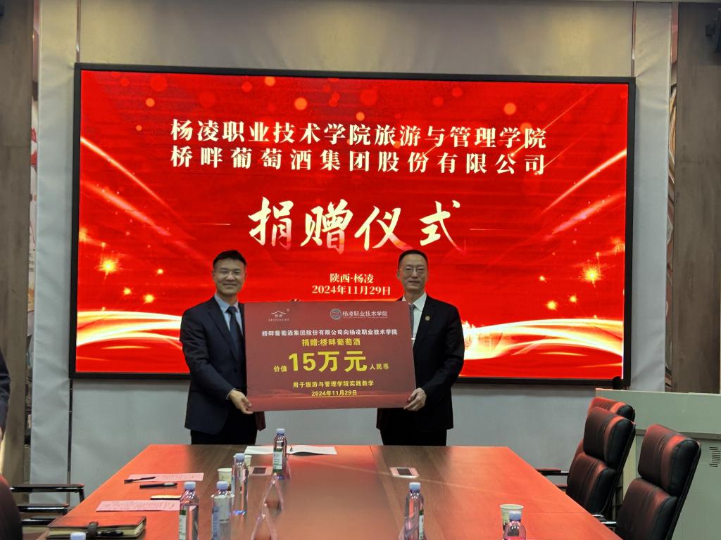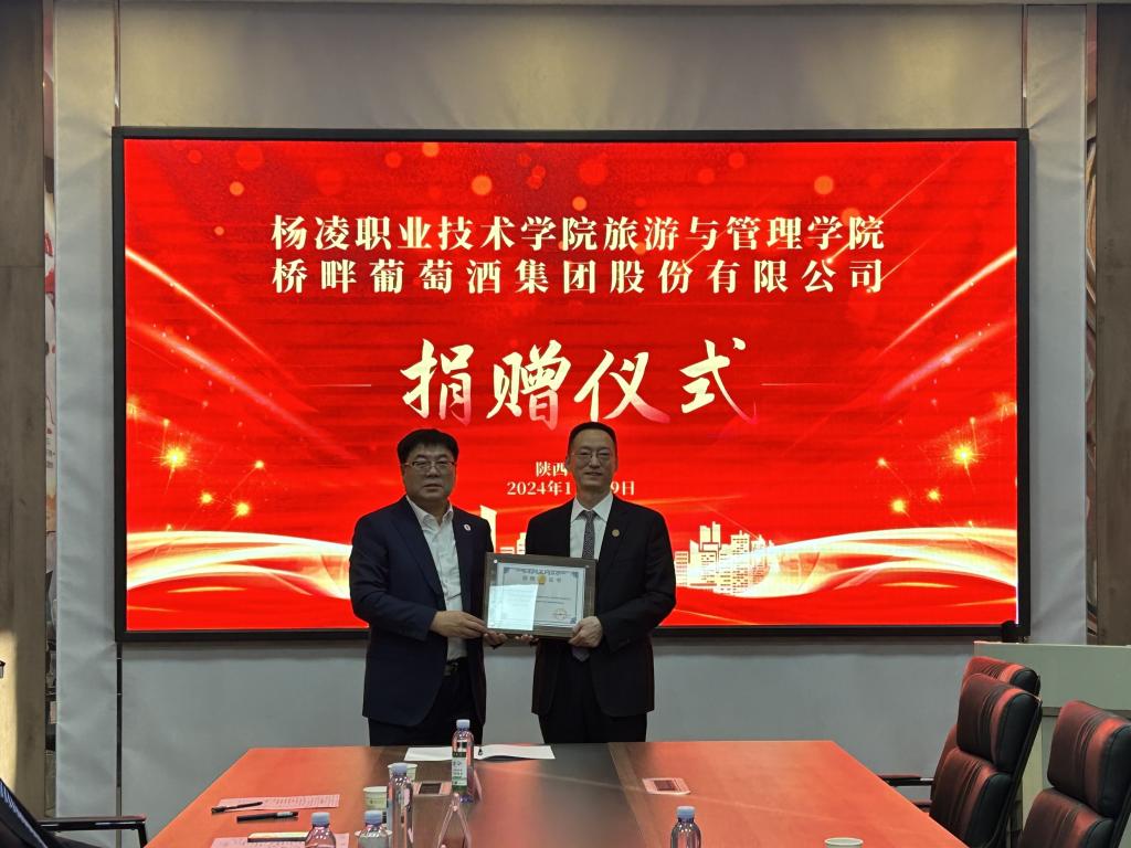 会上,桥畔葡萄酒集团股份有限公司捐赠价值十五万元的桥畔葡萄酒,用于旅游与管理学院实践教学,助力酒店管理与数字化运营专业建设和职教发展。校企双方签订捐赠协议。刘瑞明向桥畔公司颁发捐赠证书,授予桥畔公司“杨凌职业技术学院葡萄酒文化传播实践教学中心基地”铭牌。