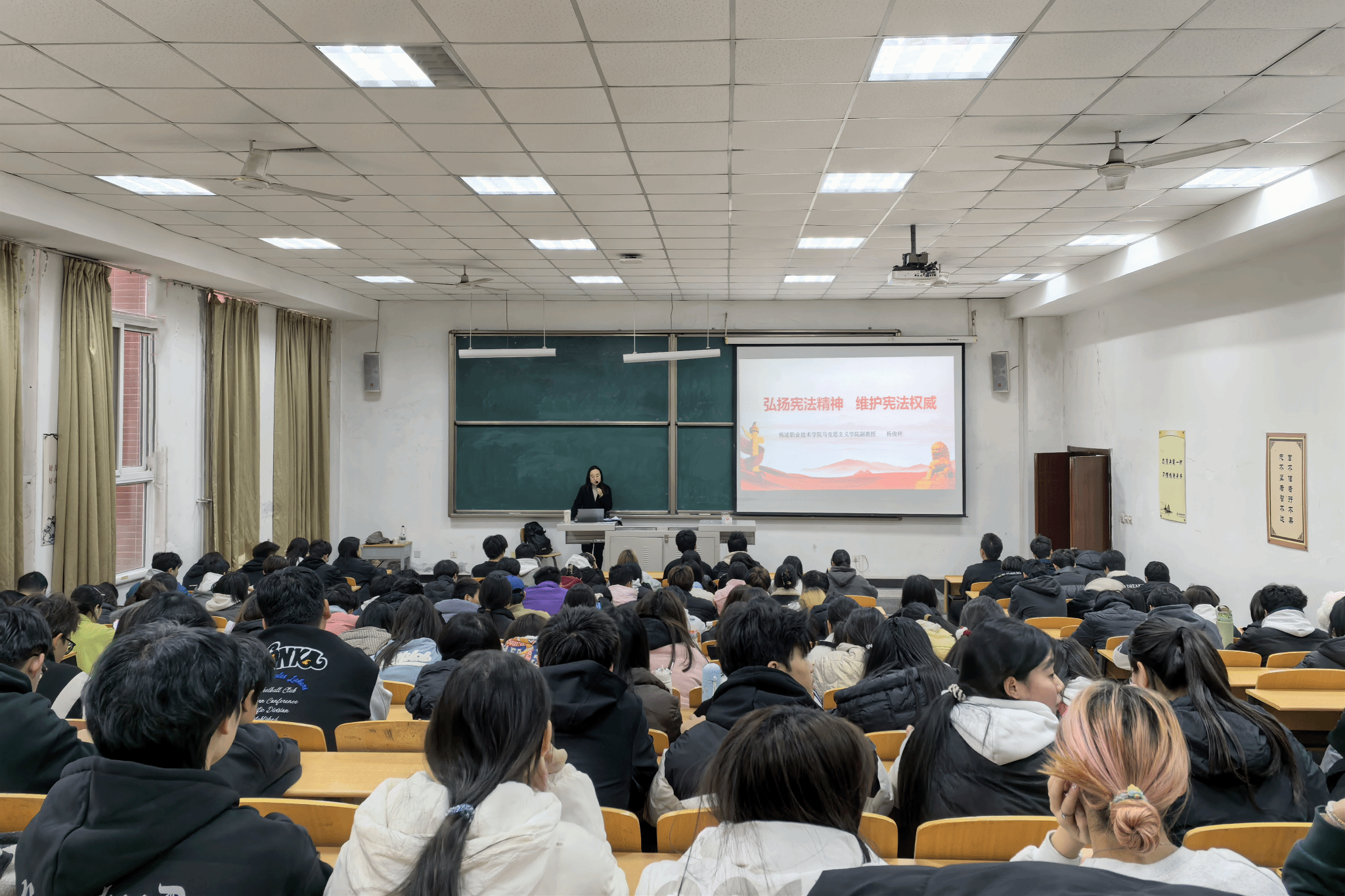 ——举办专题报告。122日,马克思主义学院举办“弘扬宪法精神 维护宪法权威”专题报告,200余名师生参加。报告会上,杨俊样副教授结合日常生活实际,深入浅出地讲解了宪法的目的及本质、宪法发展历程和公民基本权利的保障等内容,引导师生进一步了解宪法相关知识。
