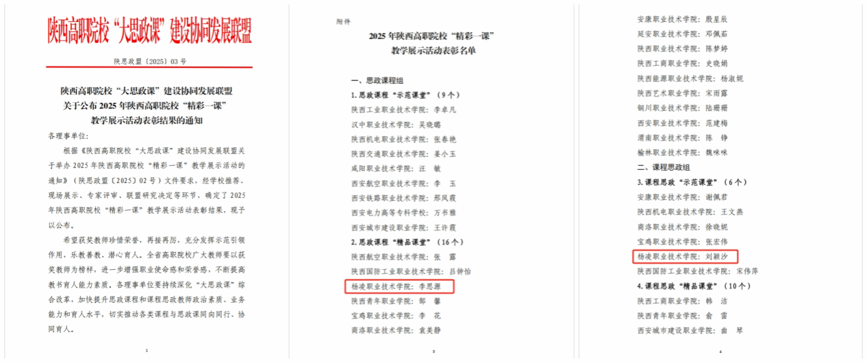 3月29日,陕西高职院校“大思政课”建设协同发展联盟2025年陕西高职院校“精彩一课”教学展示活动在陕西机电职业技术学院举办。我校生物工程学院教师刘颖沙获课程思政“示范课堂”,马克思主义学院教师李思源获思政课程“精品课堂”。