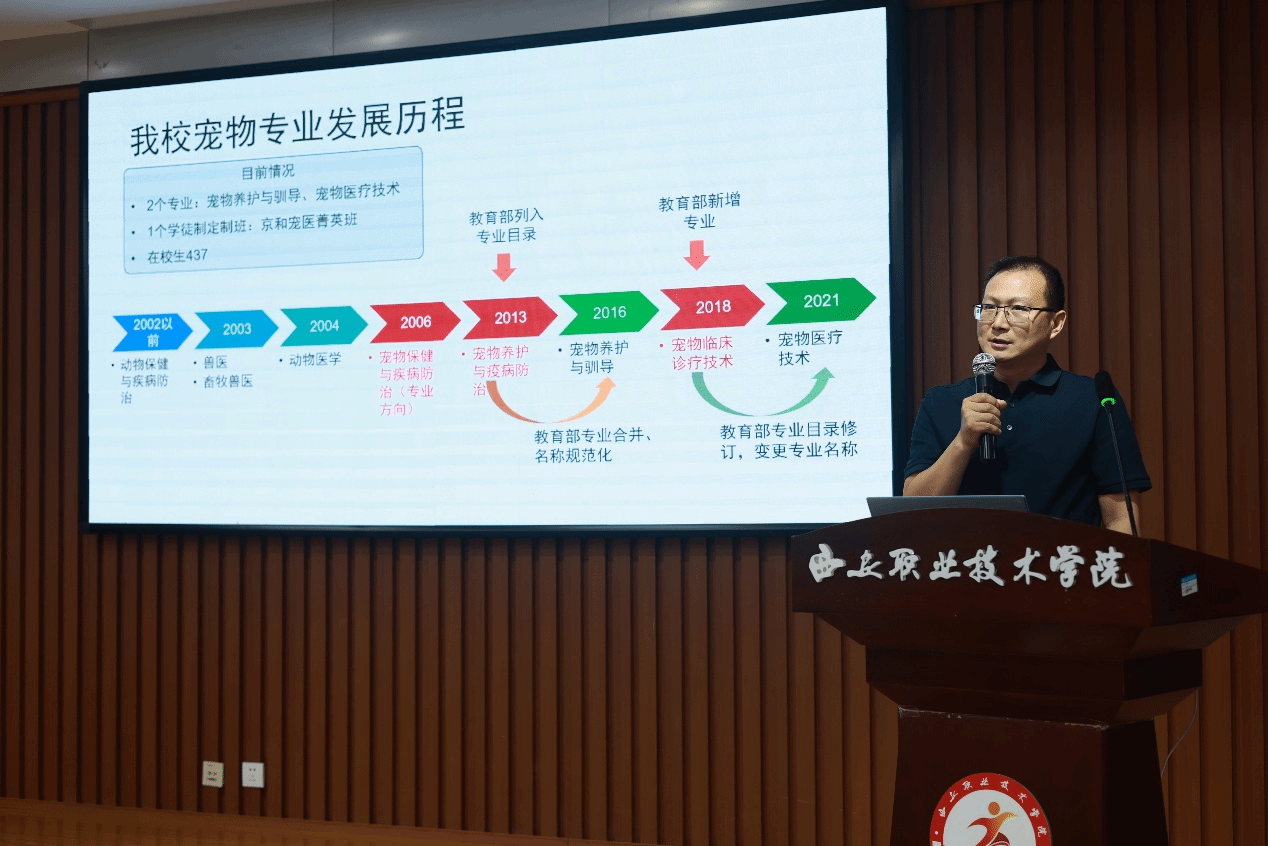 在主题报告阶段,动物工程学院教师吴礼平以《职业教育宠物专业人才培养模式探索与思考》为题,介绍了学校在“中高本”一体化专业布局下以“京和宠医菁英班”为标志的宠物专业人才培养模式改革做法和成果。