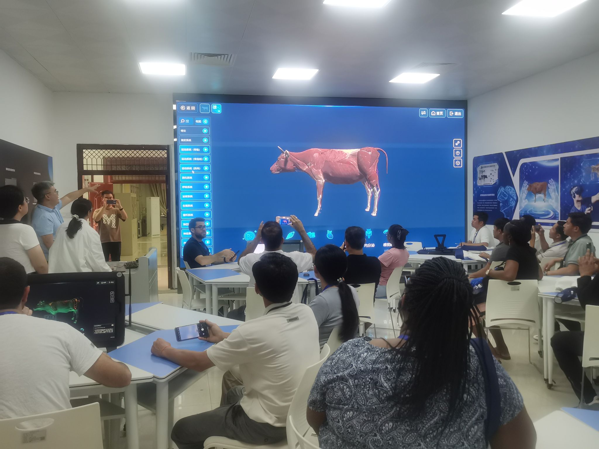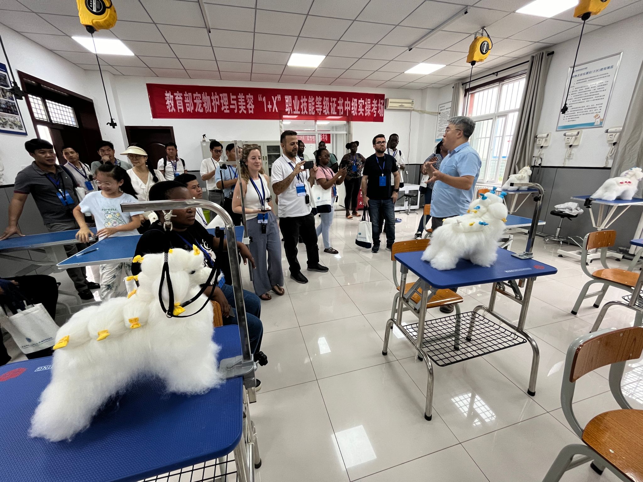 研修班成员在西校区动物工程学院动物疫病检测中心、动物解剖虚拟仿真教学实训中心、宠物美容实训中心与我校教师就现代畜牧技术进行深入探讨,并实地体验了宠物护理,动物虚拟解剖技术,表示本次实践学习受益匪浅。