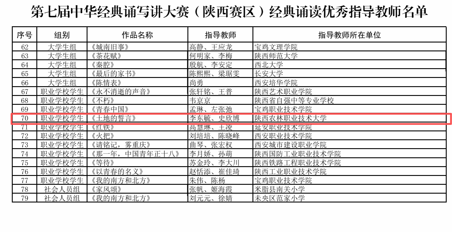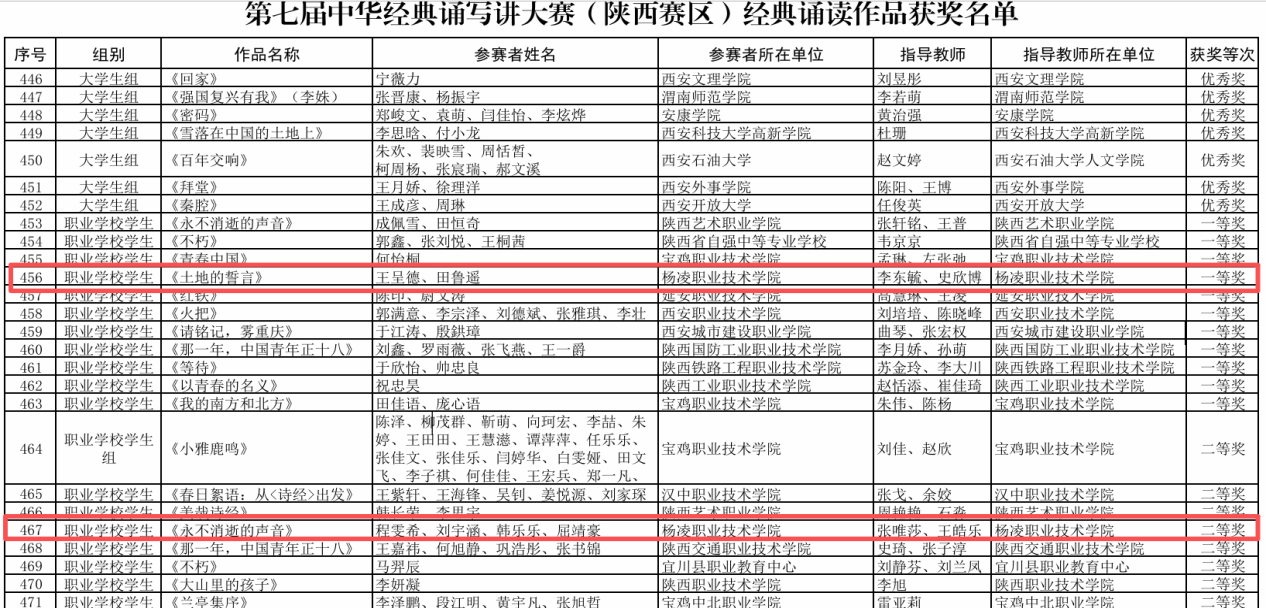 近日,由教育部、国家语委主办的第七届中华经典诵写讲大赛“诵读中国”经典诵读大赛陕西赛区评选顺利结束。自大赛启动以来,我校高度重视,师生积极参与,深入挖掘中华经典文化内涵,经多轮筛选与打磨,由王呈德、田鲁遥参演的《土地的誓言》获省级一等奖,由程雯希、刘宇涵、韩乐乐、屈靖豪参演的《永不消逝的声音》获省级二等奖,均入围国赛决赛;由朱烨、高佳怡、吕天豪、任梦茹参演的《大堰河——我的保姆(节选)》获省级三等奖。文理学院教师李东毓、史欣博获评省级优秀指导教师。