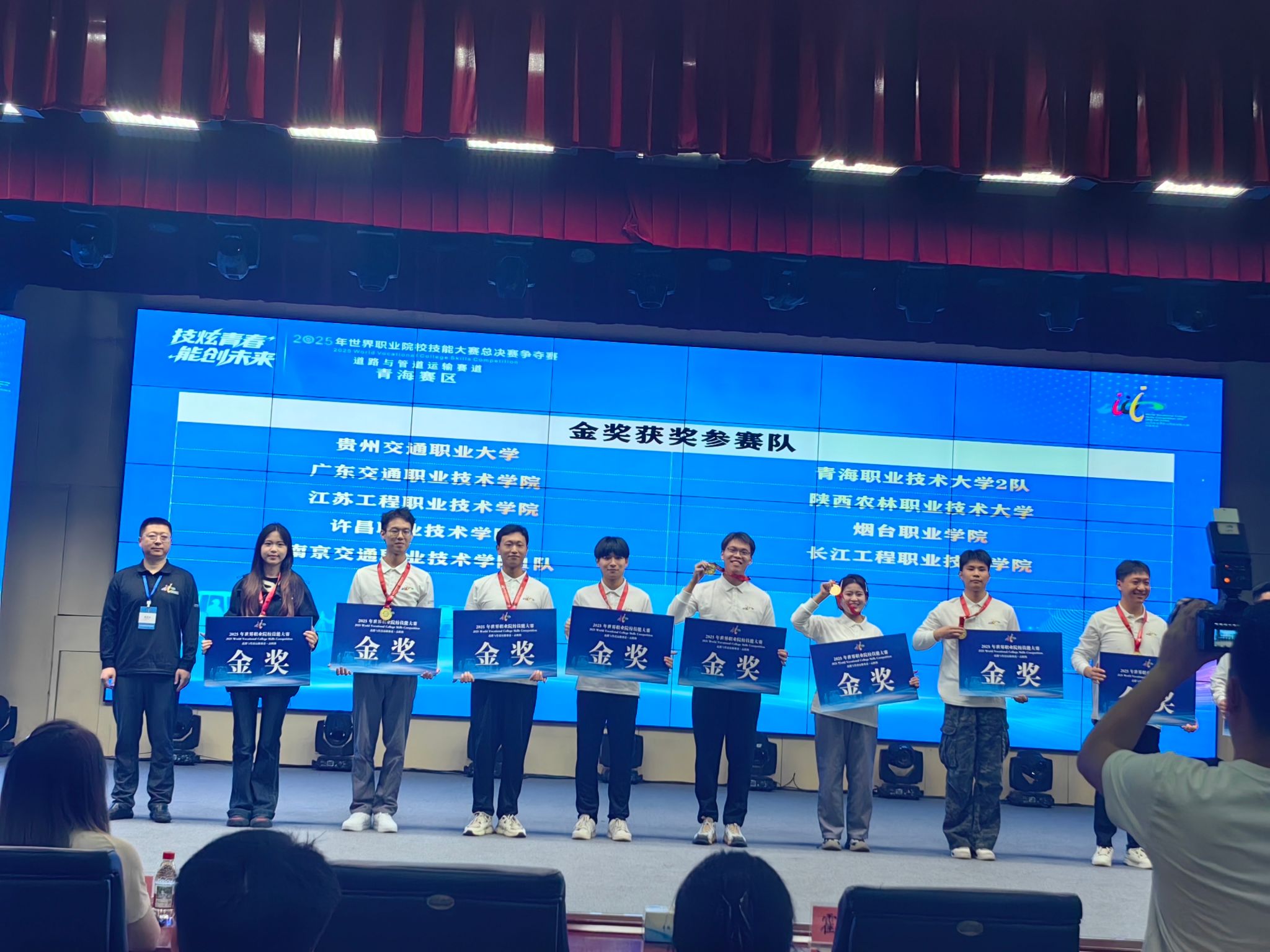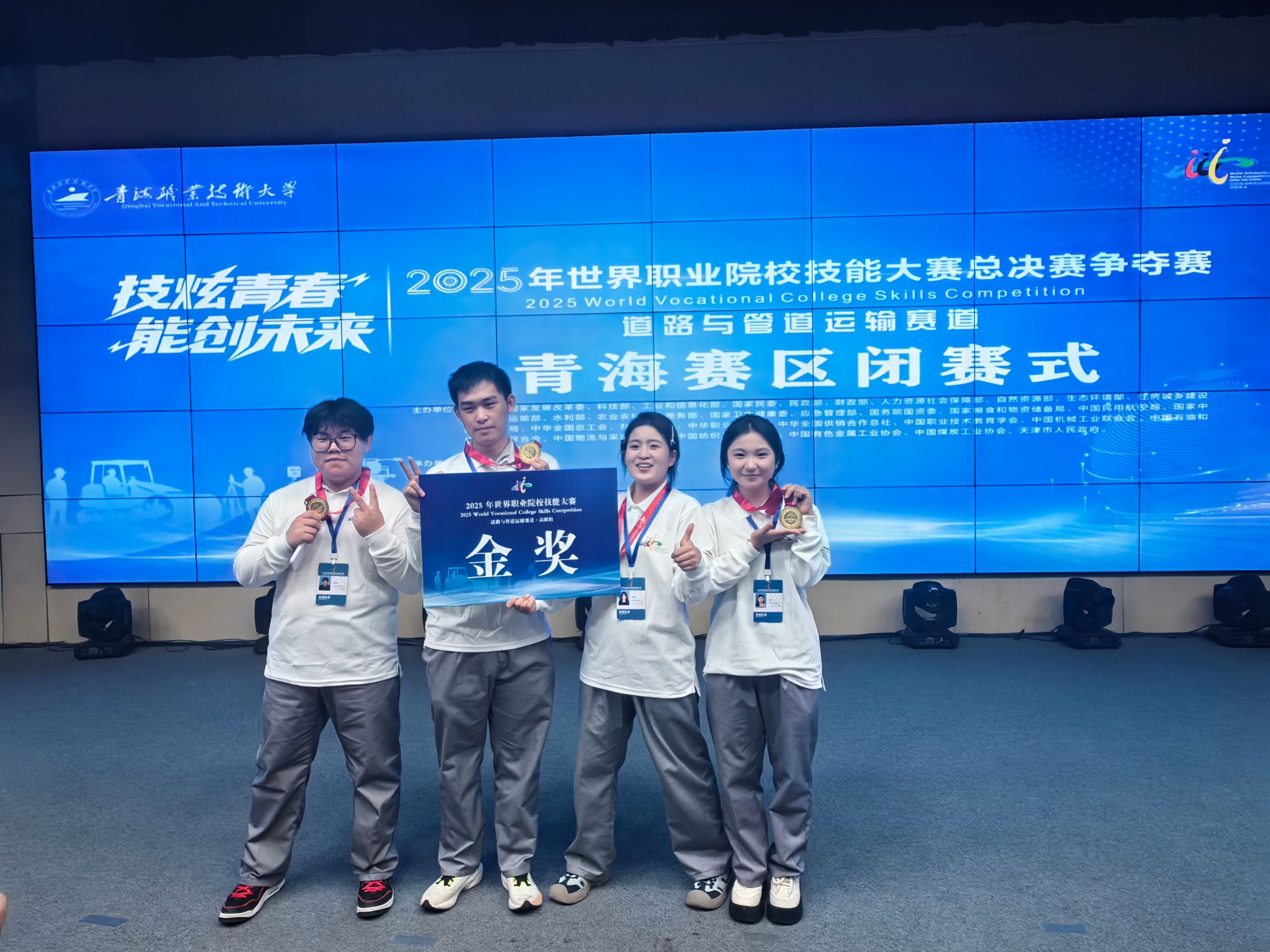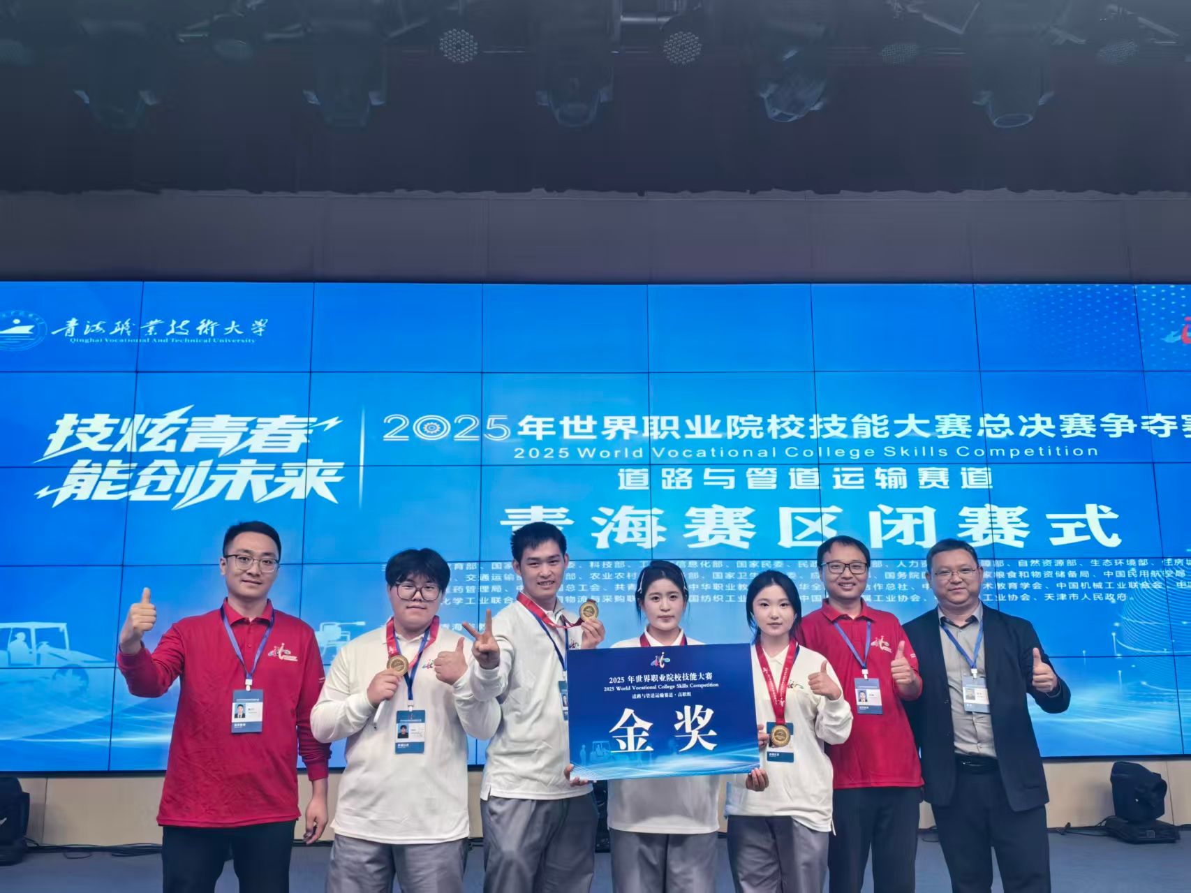 9月10日至13日,以“技炫青春 能创未来”为主题的2025年世界职业院校技能大赛总决赛争夺赛高职组道路与管道运输赛道比赛在青海西宁成功举行。本次赛事吸引了全国87所高职院校的340余名选手同台竞技,竞争激烈。由校交通与测绘工程学院卫少阳、穆江飞老师指导,杨琴琴、李联坤、王蓉和查斌斌四位同学组成的代表队,凭借扎实的专业技能和出色的现场表现,勇夺小组第一,斩获大赛金奖。