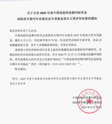 9月29日,中国高校科技期刊研究会先后公布了2025年度专项基金项目立项评审结果和首届高职高专期刊高影响力论文案例库征集评选结果。我校学报编辑部吴薇副研究员主持申报的《“新双高”背景下高职院校学报高质量发展路径研究与探索》课题,经多轮筛选,从76项申报项目中脱颖而出,获批高职高专期刊专项基金资助项目。由牛永浩等人撰写的《昆虫信息素在松墨天牛防治中的应用研究》一文,刊载于2024年第3期《杨凌职业技术学院学报》,从全国参选的81篇论文中脱颖而出,成功入选首届高职高专期刊高影响力论文案例库。