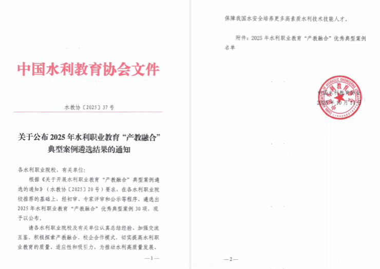 据悉,本次案例评选共遴选出2025年水利职业教育“产教融合”优秀典型案例30项学校的案例总结呈现了学校深化职业教育产教融合校企协同育人的经验做法创新实践。下一步,学校将以产教融合为重要抓手,持续深化校企协同育人机制,在提升职业教育内涵与活力的道路上不断探索。通过构建更具实效的合作模式,培养更多专业过硬、实践能力强的高素质技术技能人才。